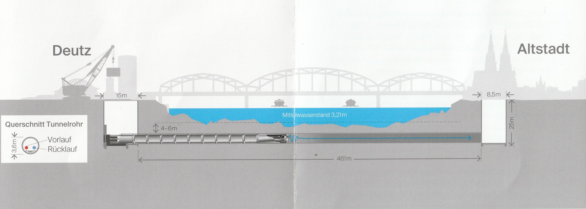 Anfang der 1980er Jahre entstanden Überlegungen, wie man den rechtsrheinischen Stadtteil Deutz an das größte bestehende Fernwärmenetz ‚Innenstadt‘ anschließen könnte. Die Rohre unter der Hohenzollernbrücke zu montieren, war aus statischen Gründen nicht umsetzbar. Eine weitere Überlegung, sie quer durchs Rheinbett zu verlegen, würde jedoch den Schiffsverkehr auf der stark befahrenen Wasserstraße beeinträchtigen. So entschied man sich für den Tunnel, die außergewöhnlichste und baulich anspruchsvollste Lösung.