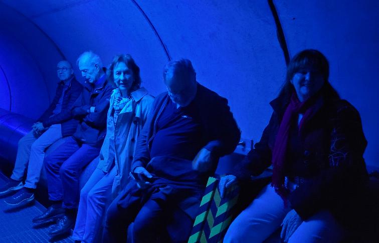 Nach der Theorie folgte die Praxis. Wir standen vor der dunklen Röhre, durch die zwei dicke Rohre führten. Auf Knopfdruck erleuchtete in der Ferne ein schwaches Licht, das Ziel unseres Weges. Durch die dann hell erleuchtete Röhre gingen wir dann auf dem Gittersteg zur anderen Rheinseite. Nachdem wir rund 230 Meter in den Tunnel hineingelaufen sind, sind wir in der Mitte des Tunnels angekommen, zu erkennen auch an dem blauen Licht, das das Wasser symbolisieren soll.