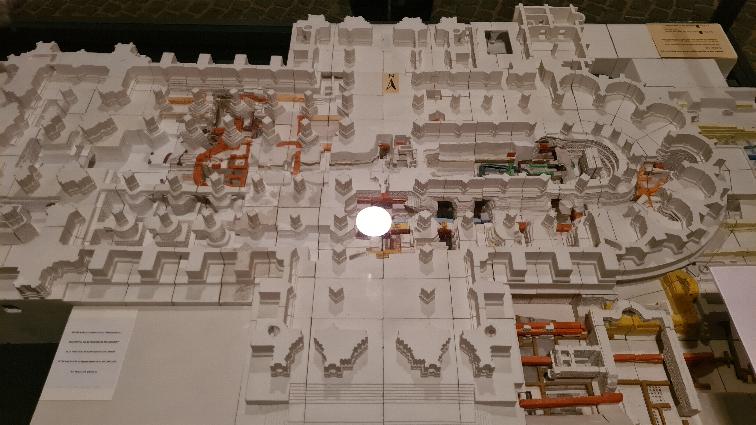 Durch einen kleinen Nebeneingang betraten wir die ‚Hohe Domkirche zu Köln‘. Nach der Begrüßung und Einweisung führte uns eine schmale Treppe hinab in den Untergrund des Doms. Dieser wird bereits seit 1946 archäologisch untersucht. Neben dem praktischen Nutzen, die Fundamente auf etwaige Kriegsschäden hin zu überprüfen, bot sich damals die Chance, die historisch überlieferte Vorgängerbebauung und schließlich auch die Entstehungsgeschichte des gotischen Domes zu erforschen. An einem maßstabgetreuen Modell des Grundrisses des Doms wurde uns die Baugeschichte erläutert.